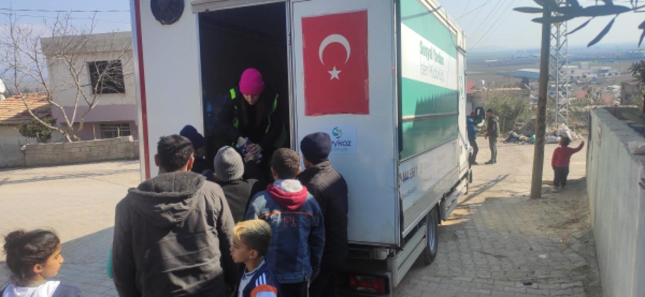 Beykoz Belediyesi, deprem bölgelerinden 239 personel, 71 iş makinesi ve araçla çalışmalarını sürdürürken Hatay Kırıkhan Gençlik Merkezi yanında kuruduğu aşevi, mobil tuvalet, duş alanları ve içme suyu tankerleriyle günlük yaşamsal ihtiyaçları karşılıyor.