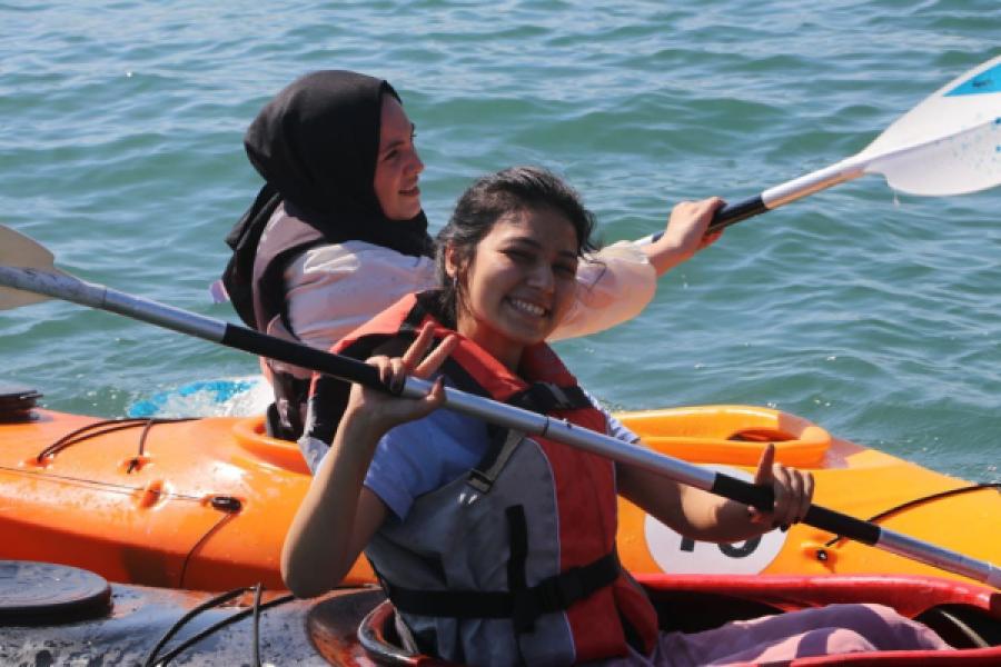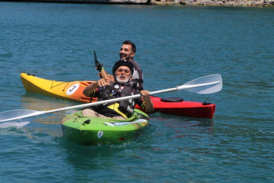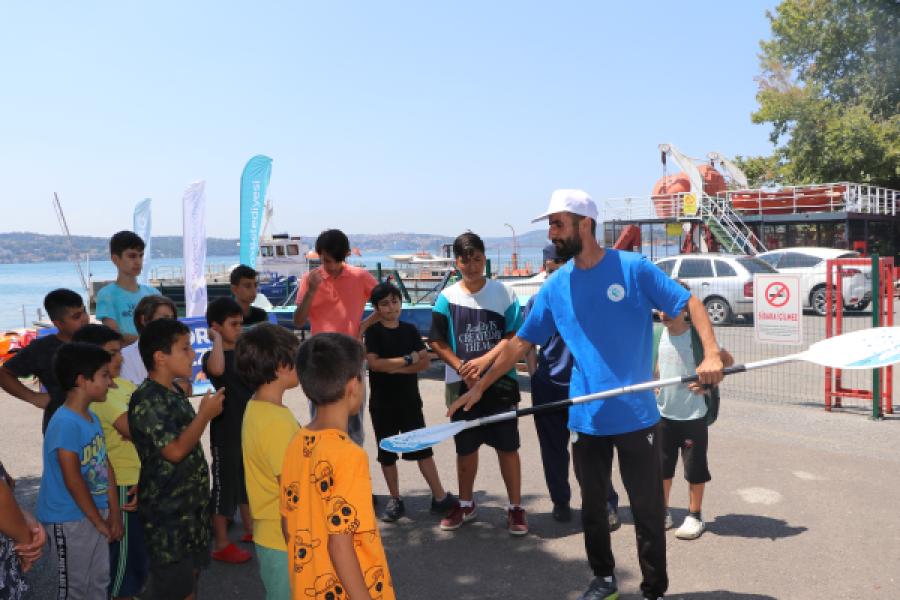 Su Sporları Merkezi’nde kano yapmak için gelen ilçe sakinlerine öncelikle ekipmanlar ve kullanımları anlatılıyor, ardından eğitmenler eşliğinde denizde kano keyfi başlıyor.