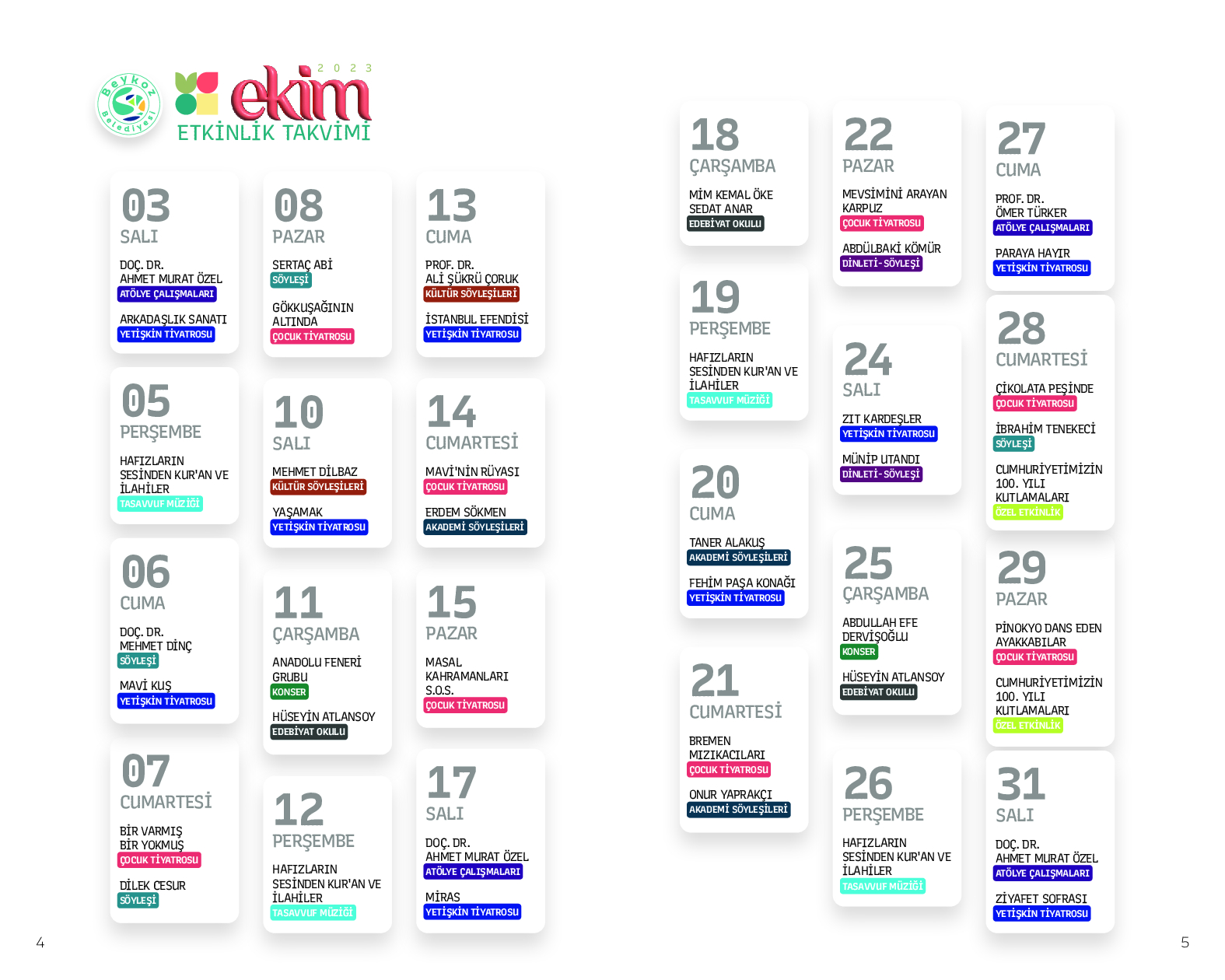 Beykoz’da her yaştan ilçe sakininin keyifle izleyeceği bir birinden güzel ve nitelikli etkinliklere ev sahipliği yapacak “2023-2024 Kültür-Sanat Sezonu” zengin bir içerikle dolu “Ekim Ayı Ajandası”yla açıldı.