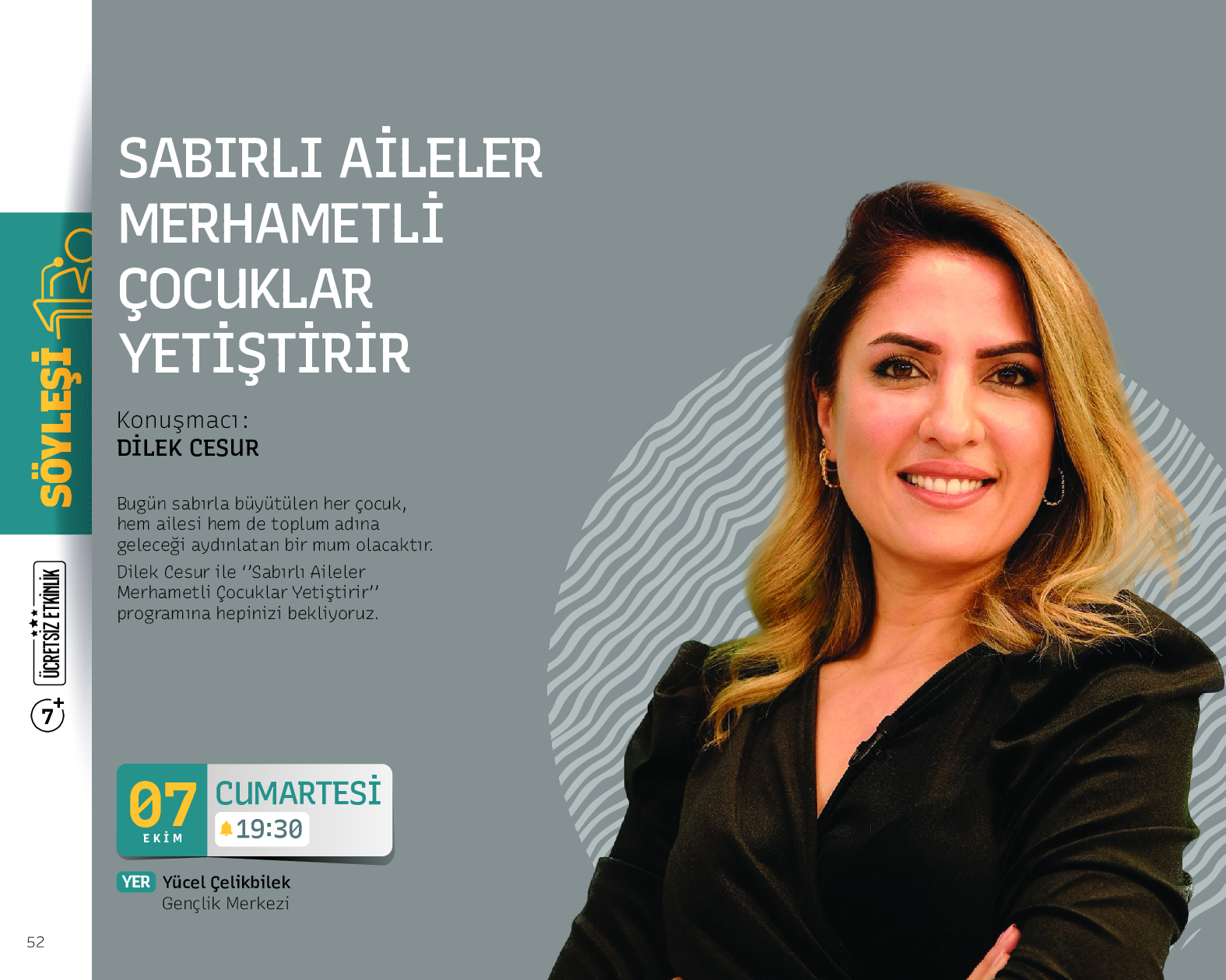 Kitaplarında çocuk ve gençlerle iletişimde ailelere rehberlik eden Yazar Dilek Cesur ise merhamet eksenli bir söyleşi gerçekleştirecek. Doç. Dr. Mehmet Dinç de ilçe sakinleriyle buluşmasında modern yaşamda duyguları tanımanın önemine değinecek.