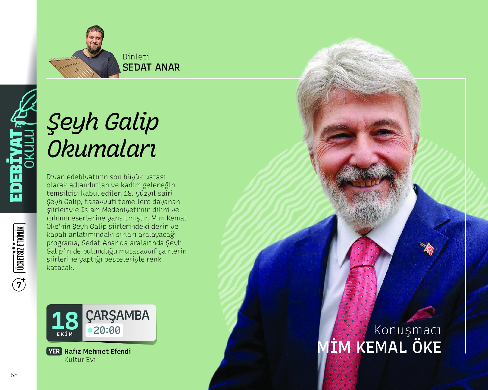 Bir birinden değerli yazar ve akademisyenlerin ağırlanacağı “Edebiyat Okumaları”nda, Türk Edebiyatı’nda iz bırakan kitaplar, yazar ve şairler ustalarla masaya yatırılacak. Doğu klasiklerinin inceleneceği buluşmalarda modern şairler de tanıtılacak.