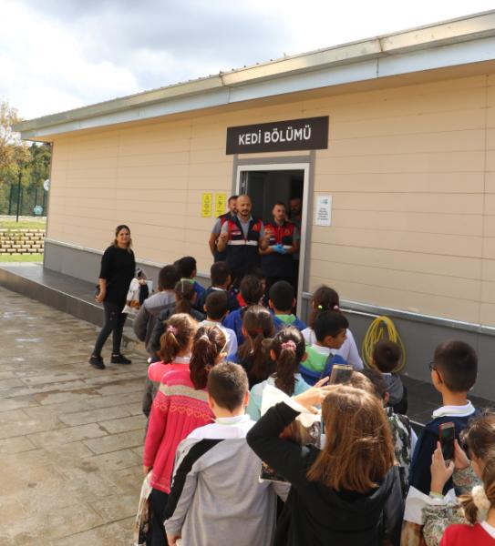 Rehabilitasyon Merkezi’ndeki deki hayvanlara ziyaret boyunca sevgi ve ilgilerini sunan çocuk ve gençler, kedi ve köpeklerin barındığı mevcut kulübeleri rengârenk el baskılarıyla süsledi.