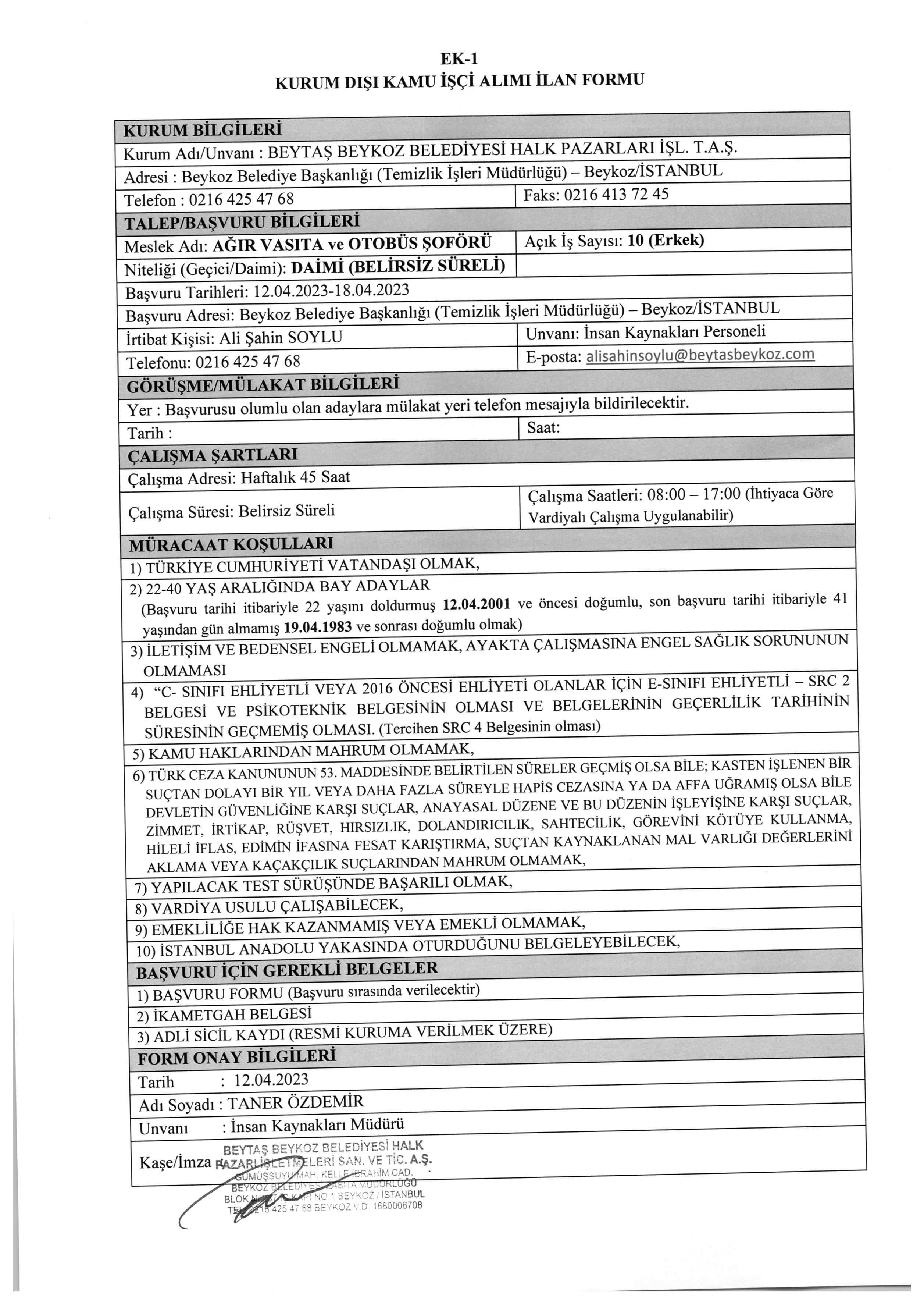 Beytaş A.Ş. Personel Alım Duyurusu (MAKAM ŞOFÖRÜ)