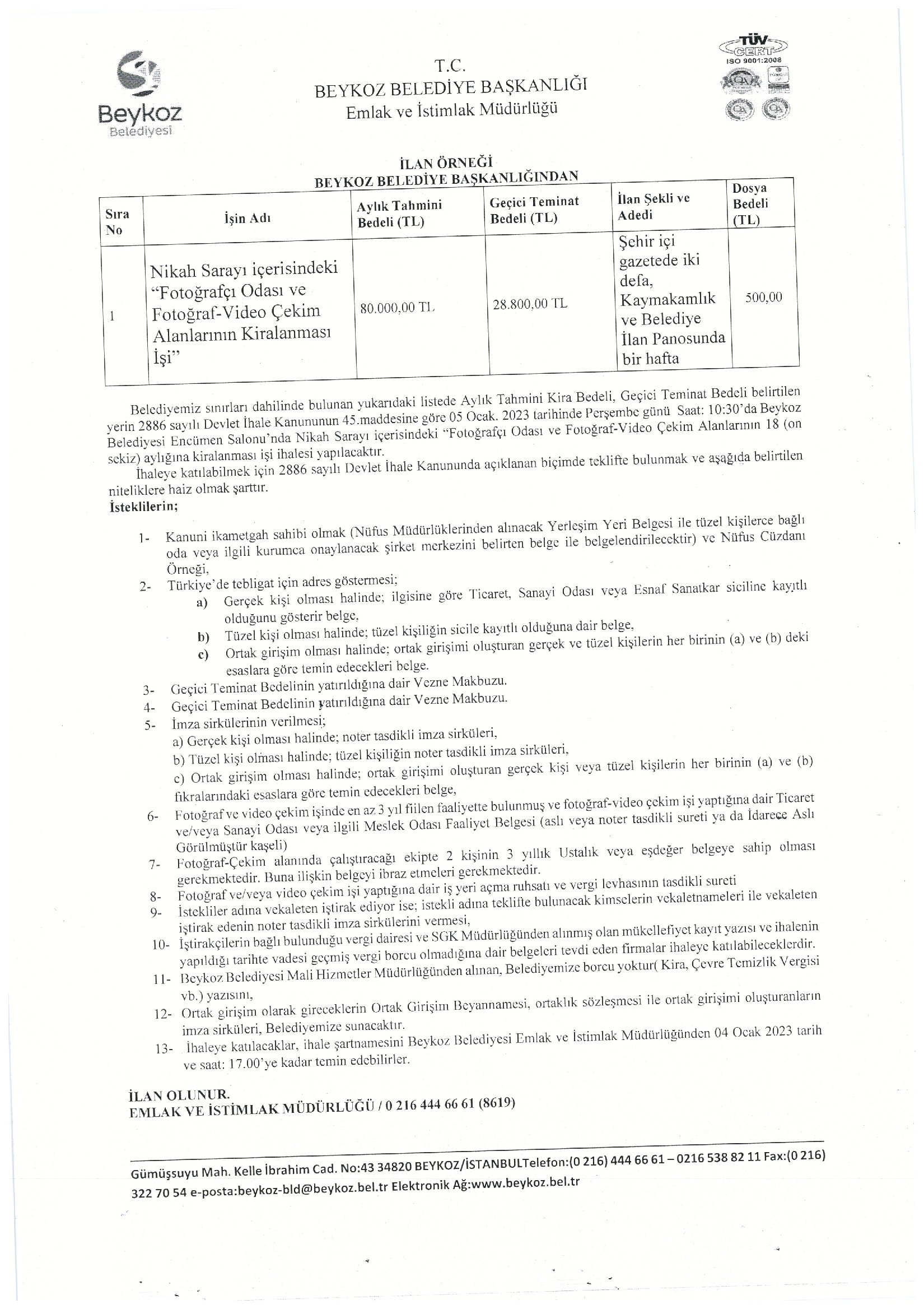 "Fotoğrafçı Odası ve Fotoğraf-Video Çekim Alanlarının Kiralanması İşi" Açık İhale İlanı