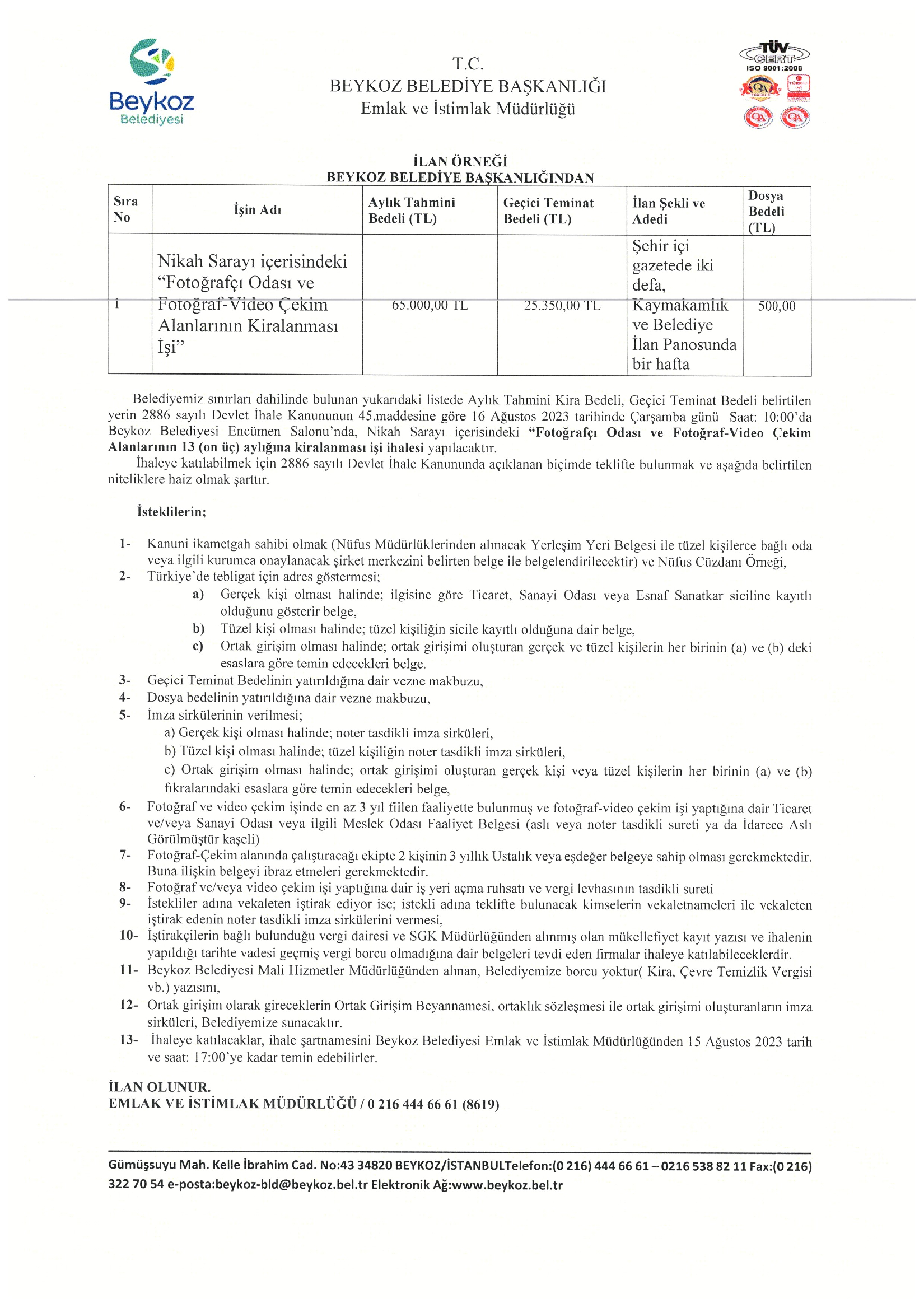 FOTOĞRAFÇI ODASI VE FOTOĞRAF- VİDEO ÇEKİM ALANLARININ KİRANLANMASI İŞİ