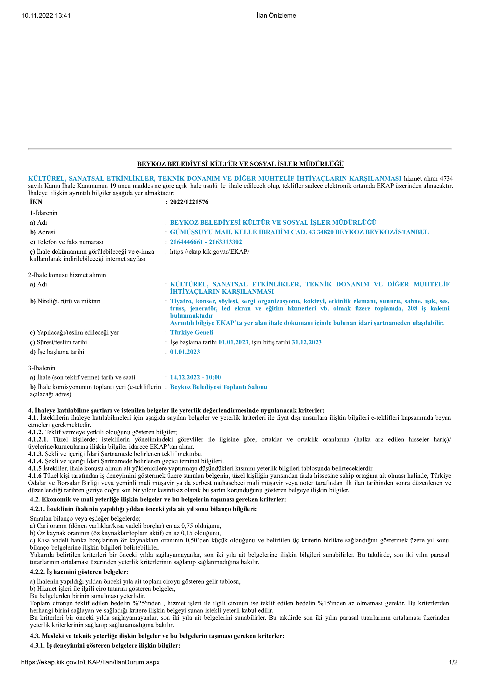 KÜLTÜREL, SANATSAL ETKİNLİKLER, TEKNİK DONANIM VE DİĞER MUHTELİF İHTİYAÇLARIN KARŞILANMASI