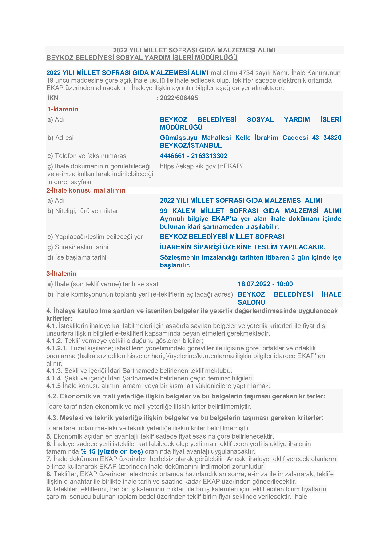 MİLLET SOFRASI GIDA MALZEMESİ ALIMI