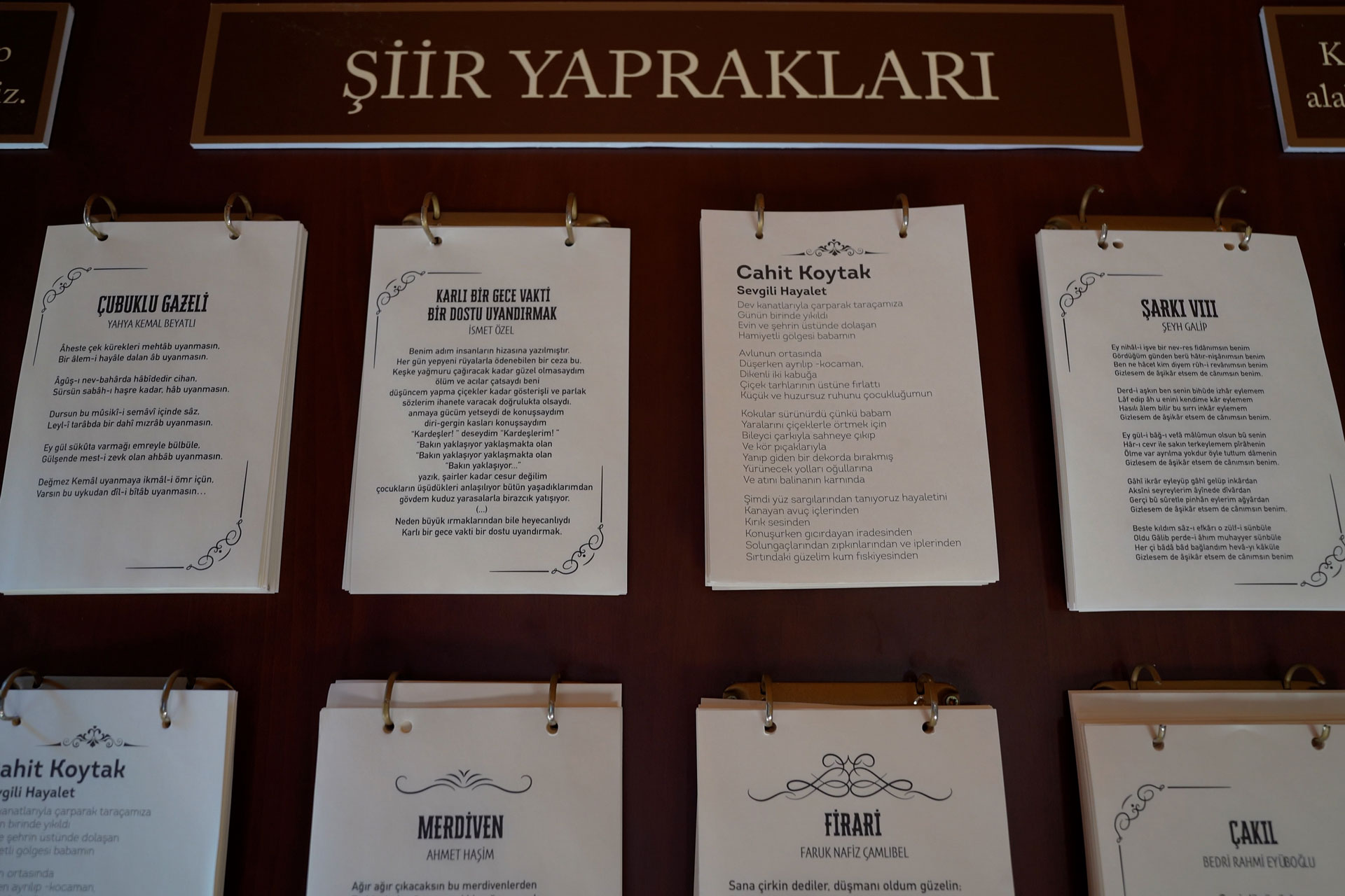 Müze ziyaretçileri çıkış kapısında Türk edebiyatından usta yazarların şiirlerinden diledikleri bir şiir yaprağını hatıra olarak yanlarında götürebiliyor.
